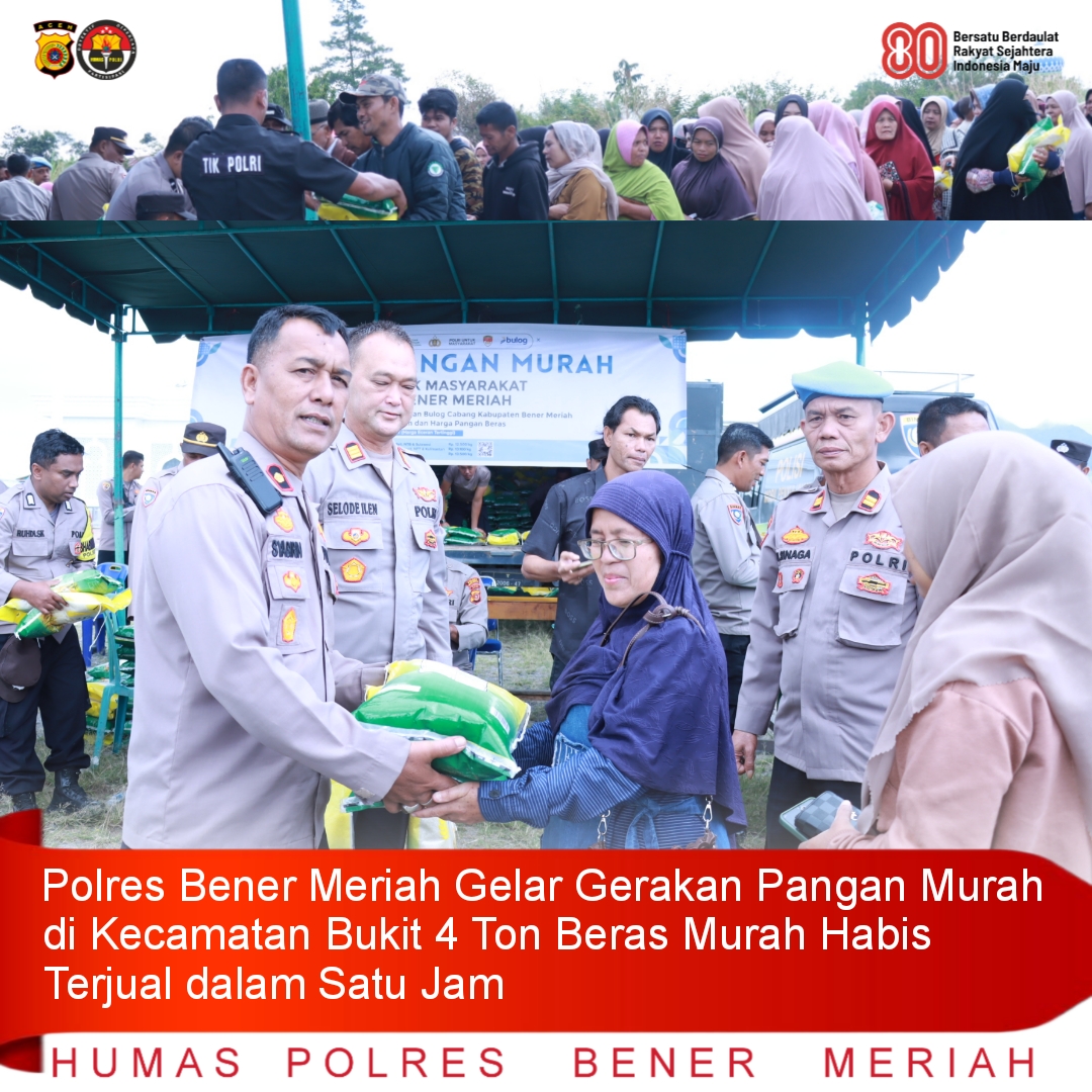 Kegiatan ini dipimpin langsung oleh Wakapolres Bener Meriah, Kompol Dr. Syabirin, S.H., M.Si. didampingi Kapolsek Bukit dan Kasat Binmas, Dalam waktu hanya satu jam, sebanyak 4 ton beras premium kemasan 5 kilogram yang dijual seharga Rp62.000 per kemasan lebih murah dari Harga Eceran Tertinggi (HET) habis terjual.