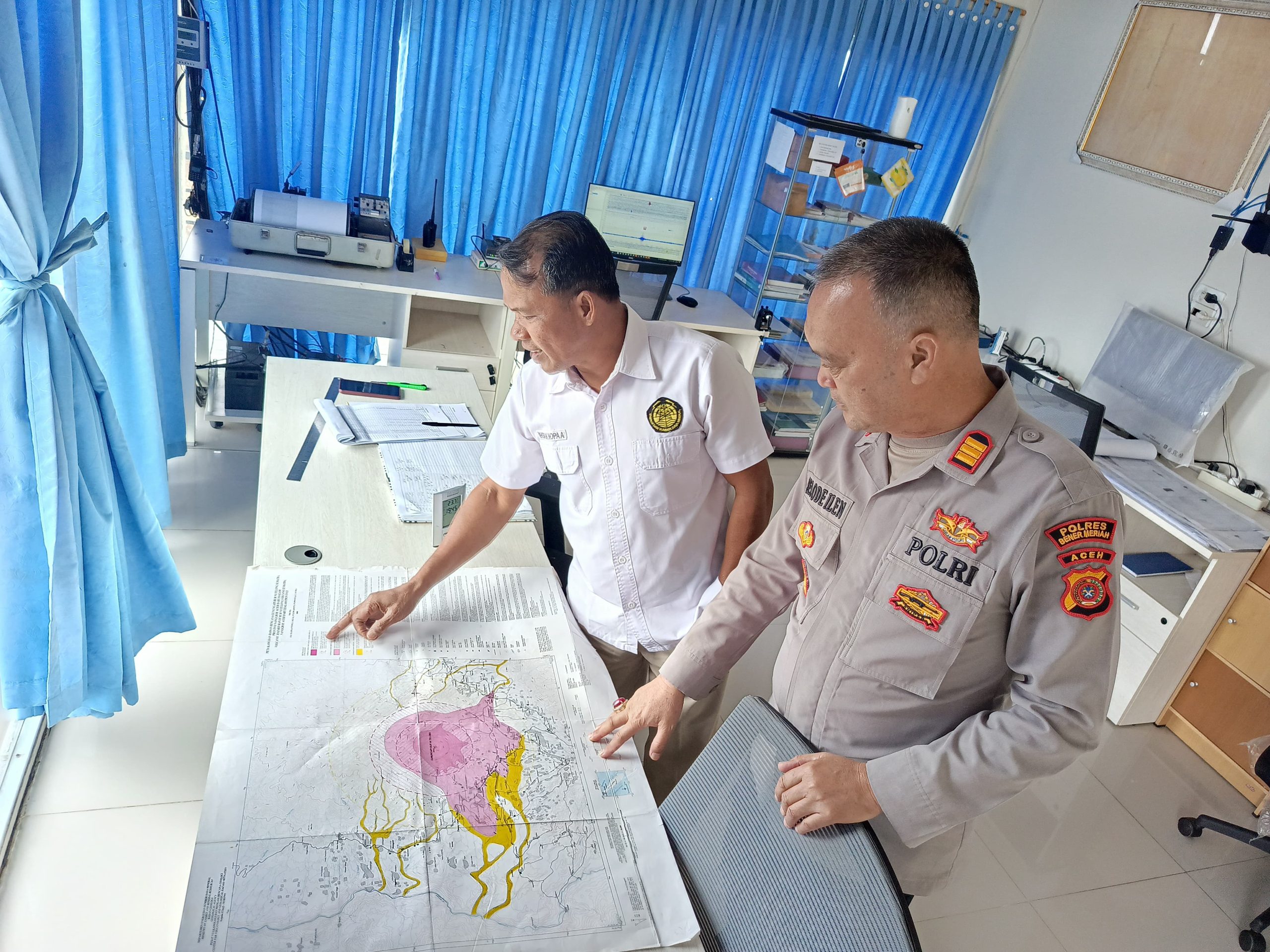 Redelong – Kapolsek Bukit AKP H. Selode Ilen melakukan koordinasi langsung dengan pihak Pos Pemantau Gunung Api Burni Telong yang berlokasi di Kampung Serule Kayu, Kecamatan Bukit, Kabupaten Bener Meriah, Senin (25/8/2025)
