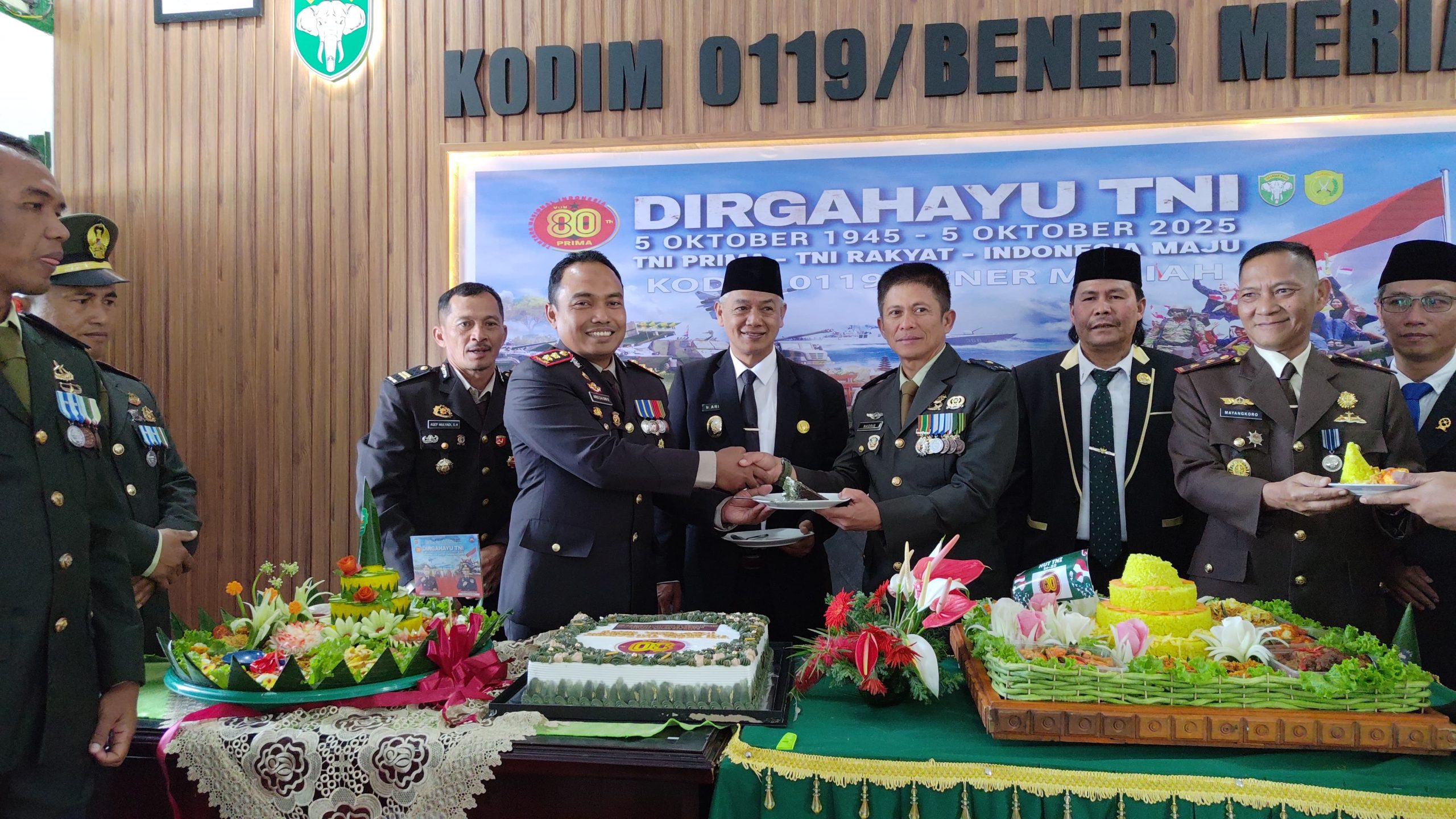 Redelong – Polres Bener Meriah bersama Kodim 0119/Bener Meriah memperingati Hari Ulang Tahun (HUT) Tentara Nasional Indonesia (TNI) ke-80 dengan penuh semangat solidaritas dan kebersamaan di Makodim 0119/BM, Minggu (5/10/2025).