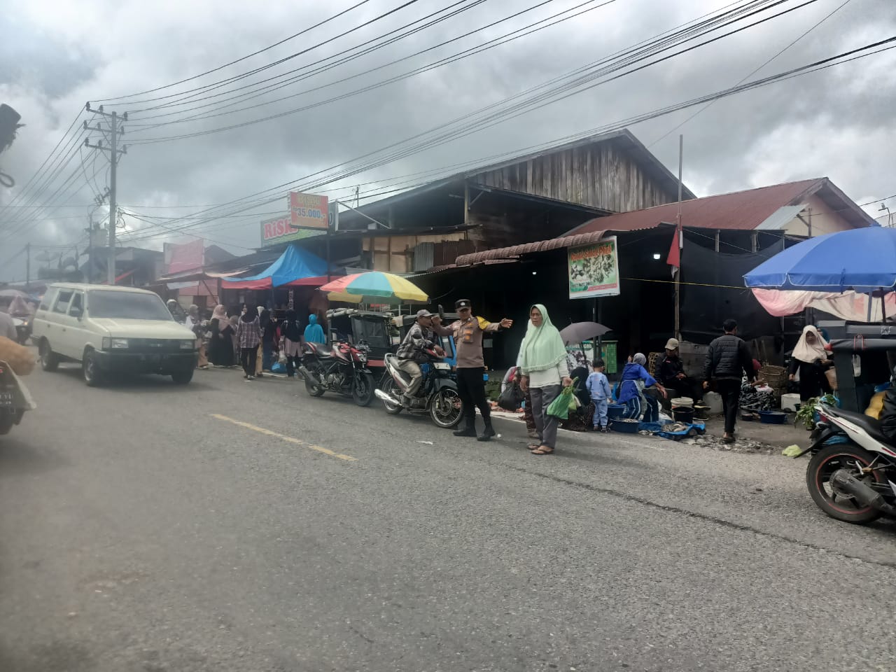 Kapolsek Wih Pesam Iptu Zahrul menyampaikan bahwa kegiatan pengaturan lalu lintas di pasar tumpah merupakan bentuk pelayanan Polri kepada masyarakat guna mencegah terjadinya kepadatan kendaraan dan potensi kecelakaan.