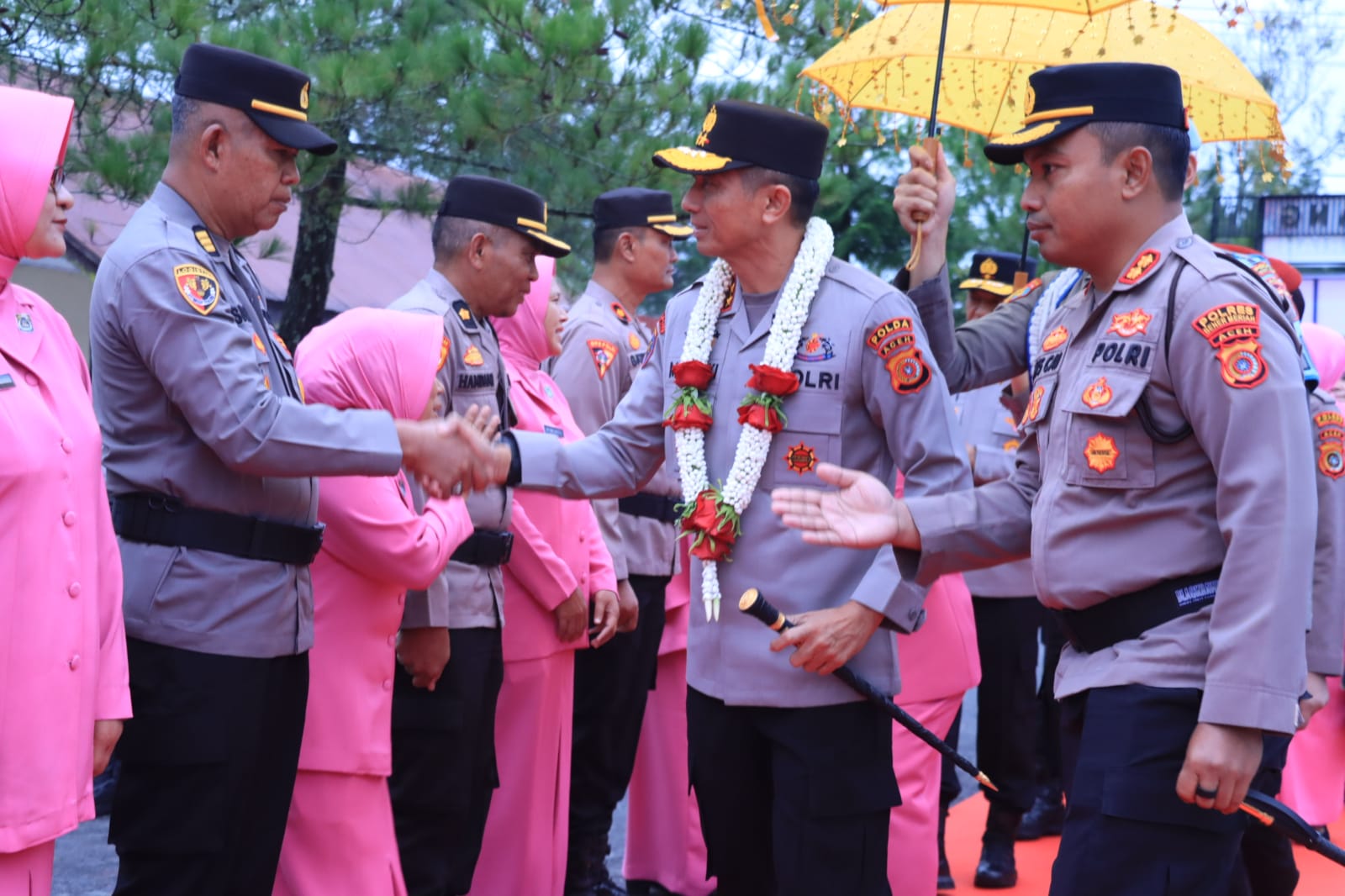 Dalam rombongan tersebut juga turut hadir Wakapolda Aceh Brigjen Pol Ari Wahyu Widodo, Ketua Bhayangkari Daerah Aceh Ny. Ira Marzuki, Karo Ops, dan Dirintelkam. Prosesi penyambutan berlangsung hangat dengan tarian Munalo sebagai bentuk penghormatan adat kepada tamu kehormatan.
