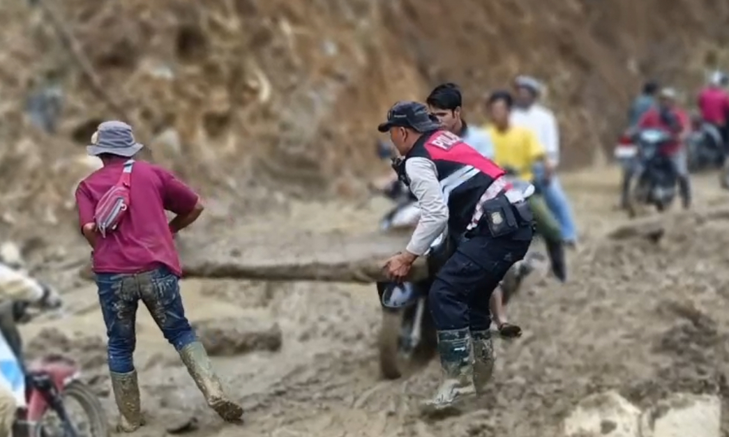 Redelong – Personel Satuan Samapta Polres Bener Meriah membantu warga yang melintasi jalan pasca longsor dengan cara mendorong kereta serta mengangkat material longsor yang menutup sebagian badan jalan, Selasa (23/12/2025).