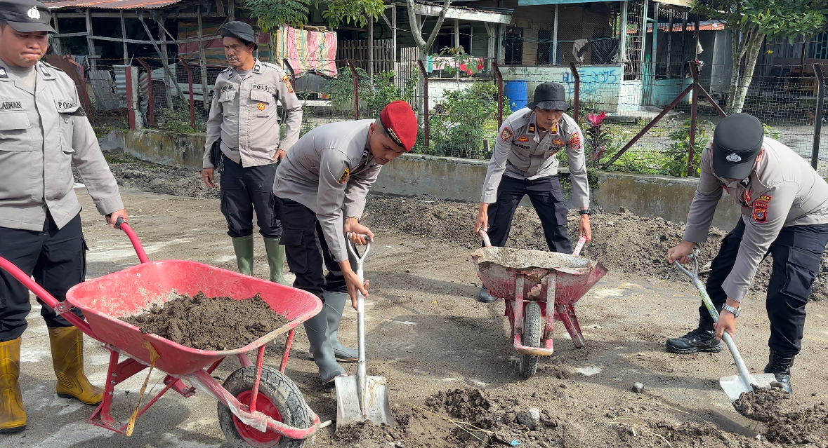 Di tengah sisa lumpur dan material longsor, polisi dan masyarakat menyatukan tenaga serta kepedulian. Kerja bakti difokuskan pada pembersihan halaman sekolah dan ruang kelas yang tertimbun pasir dan lumpur, sekaligus mengangkat sampah serta puing-puing longsor agar lingkungan sekolah kembali layak digunakan.