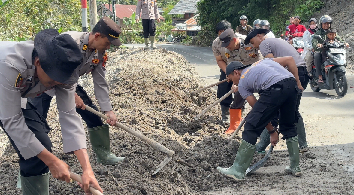 Pulihkan Mobilitas Warga, Personel Polres Bener Meriah Bersihkan Material Longsor di Jalan Pascabencana