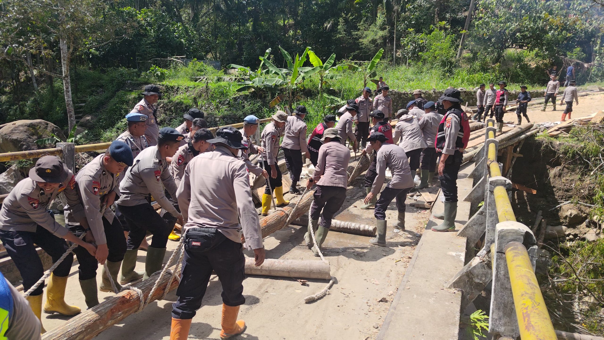 Polres Bener Meriah Bersama Sat Brimob Polda Aceh dan Warga Bangun Jembatan Sementara Pascabencana