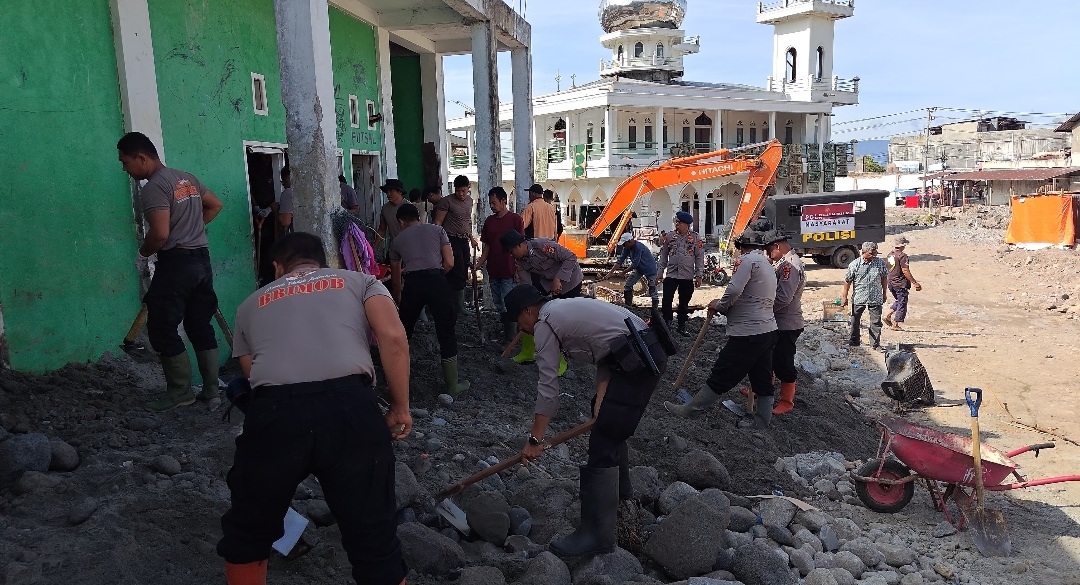Kasi Humas Ipda Eriadi mengatakan kegiatan ini tidak hanya menjadi upaya pemulihan fasilitas ibadah, tetapi juga wujud nyata kehadiran Polri di tengah masyarakat yang sedang berjuang bangkit dari musibah.