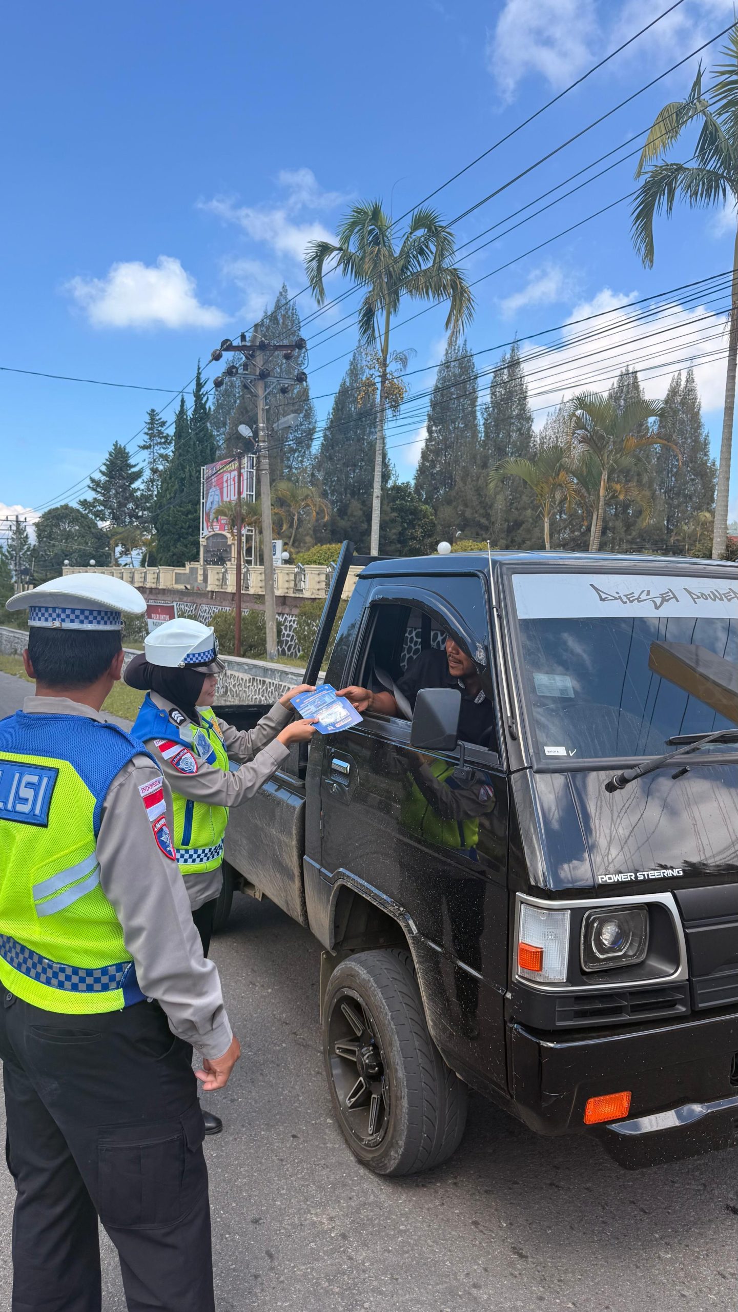 Selain melakukan penertiban terhadap pelanggar, petugas juga memberikan edukasi kepada pengguna jalan melalui pembagian brosur keselamatan berlalu lintas.