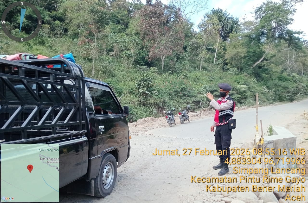 Bener Meriah- Jumat (27/2/2026).Polsek Pintu Rime Gayo bergerak melakukan monitoring dan pengamanan arus lalu lintas pasca bencana banjir dan longsor yang melanda sejumlah kampung di wilayah hukumnya pada November 2025 lalu.