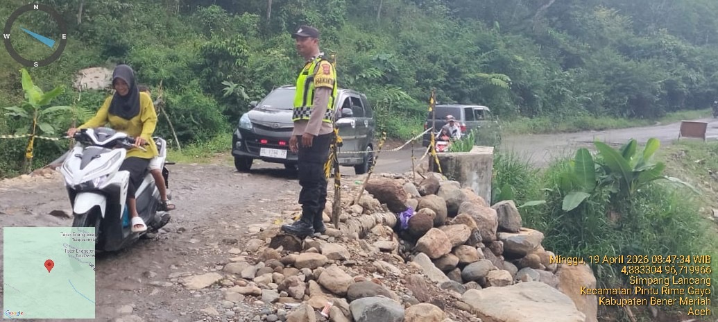 Bener Meriah – Pasca terjadinya bencana banjir dan longsor, jajaran Polsek Pintu Rime Gayo bergerak cepat melakukan monitoring serta pengamanan akses jalan dan jembatan di sejumlah titik terdampak, Minggu (19/4/2026).